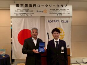 4.国際ロータリーよりメジャードナー認証クリスタル・襟ピン贈呈(油井会員)